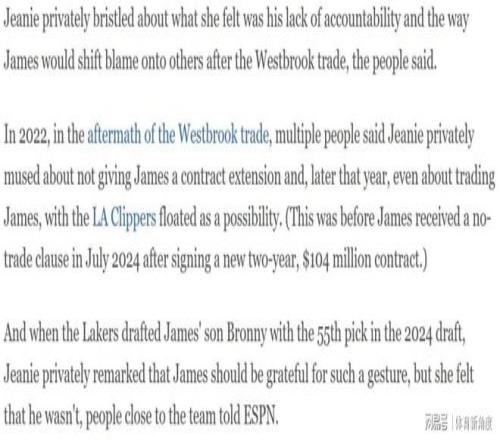 其四,2021年7月那笔拉塞尔·威斯布鲁克的交易,成为了珍妮·巴斯与詹姆斯关系恶化的重要转折点。当时,球队为了迎合詹姆斯的意愿推动了这笔交易,然而结果却是一场灾难。湖人在该赛季仅取得33胜49负的战绩,无缘季后赛。更让珍妮·巴斯不满的是,詹姆斯似乎试图撇清自己在推动这笔交易中的角色,缺乏应有的担当。据知情人士透露,珍妮·巴斯私下对詹姆斯这种“缺乏担当”以及在威少交易后“将责任推给他人”的做法极为不满。