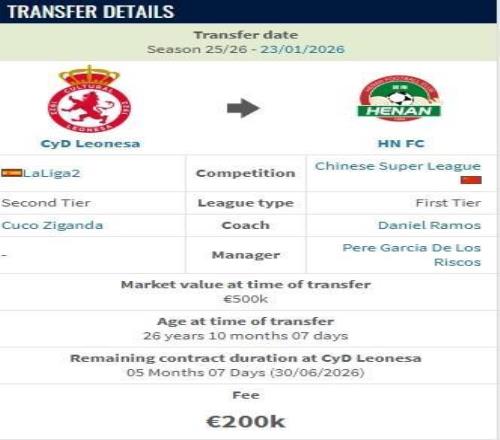 德转:西乙莱昂文体边锋姆布拉加盟河南队的转会费为20万欧