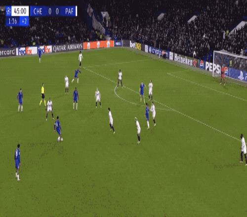 上半场补时阶段,切尔西短传渗透,哈托的小角度射门,被门将扑了出来。